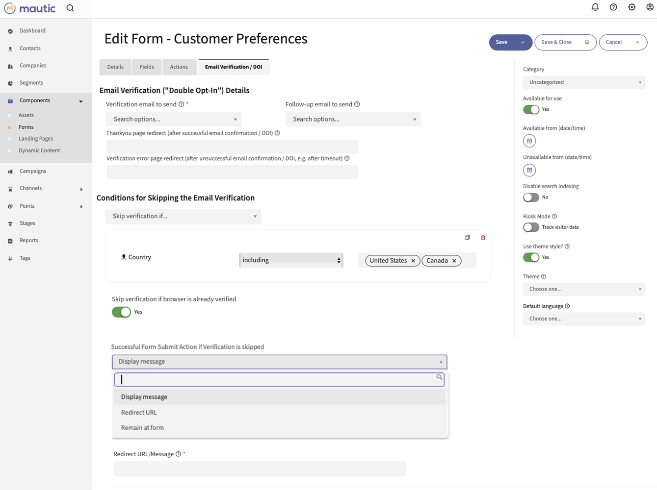 New “Email Verification / DOI” tab in Mautic form backend view